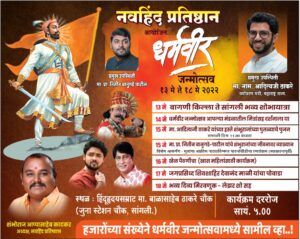 सांगली / खबऱ्या प्रतिनिधी; येथील नवहिंद प्रतिष्ठान तर्फे १३ मे ते १८ मे या दरम्यान धर्मवीर संभाजी महाराज जन्मोत्सव समारंभाचे आयोजन करण्यात आले आहे.
