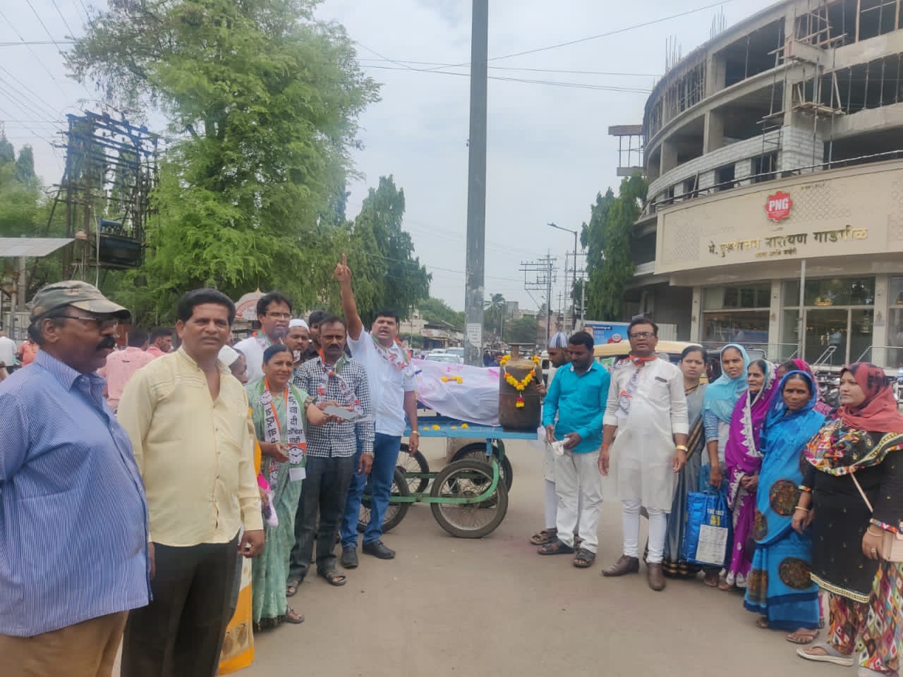 सुरवातीला चारचाकी ढकलगाड्यावरती पेट्रोल नसलेने मृत अवस्थेतील मोटरसायकल व गॅस नसलेली मोकळी टाकी, यांच्यावरती कफन घालून, गुलाल टाकून त्यांना हार अर्पण करून त्यांची अंत्ययात्रा काढण्यात यावी आणि केंद्र शासनाच्या विरोधात जोरदार निषेधाची घोषणाबाजी करण्यात आली. घोषणांनी परिसर दुमदुमुन गेला.