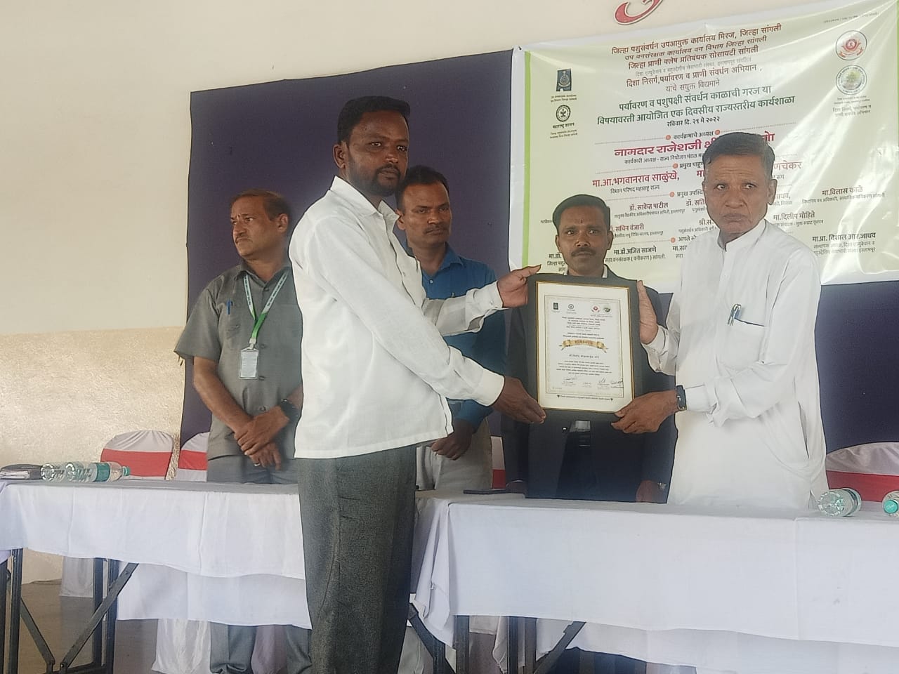 मिरज : खबऱ्या प्रतिनिधी; खंडेराजुरी येथील सामाजिक कार्यकर्ते विनोद बाळासाहेब मोरे यांच्या पर्यावरण ,प्राणी संवर्धन व सामाजिक क्षेत्रातील उल्लेखनीय कामगिरीची दखल घेऊन मोरे यांना “राज्यस्तरीय पर्यावरण मित्र” या पुरस्काराने गौरवण्यात आले. या पुरस्काराचे मान्यवरांच्या हस्ते इस्लामपूर येथे नुकतेच 29 मे रोजी वितरण करण्यात आले.