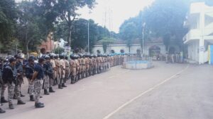 या पार्श्वभूमीवर उत्सव शांततेत पार पडावा यासाठी शनिवारी सायंकाळी उप अधिक्षक अशोक वीरकर यांच्या नेतृत्वाखाली पोलीसांचे पथसंचलन झाले. यावेळी किसान चौकामध्ये दंगल नियंत्रण पथकाचे प्रात्यक्षिक करण्यात आले.