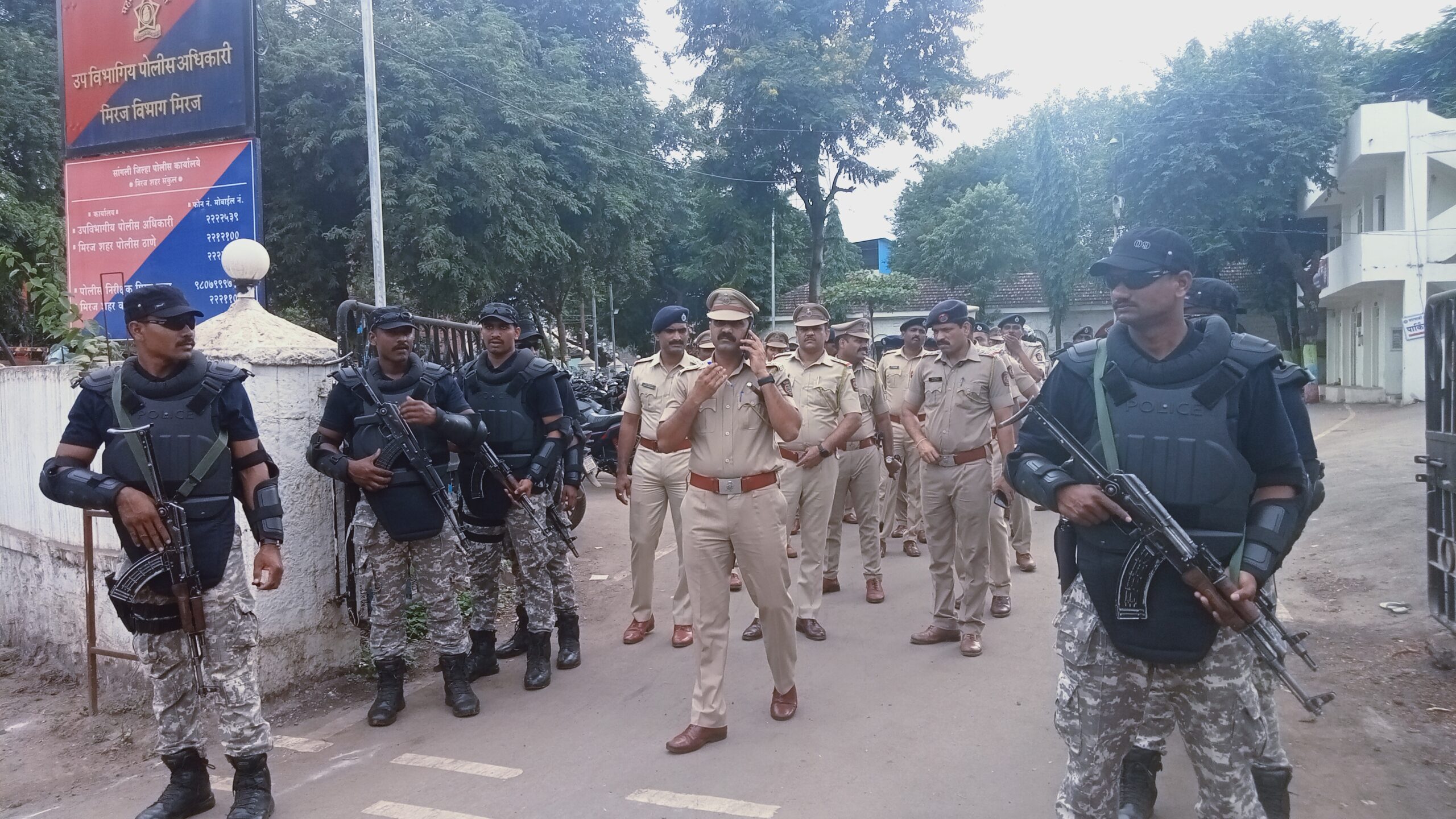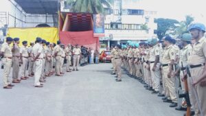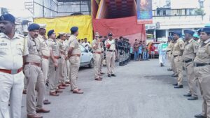 मिरज : खबऱ्या प्रतिनिधी ; गणोशोत्सवाच्या पार्श्वभूमीवर शनीवारी मिरज शहरात पोलीसांनी पथ संचलन केले. तसेच मिरज शहर पोलिस ठाण्यामधून मिरासाहेब दर्गा- माळी गल्ली- बसवेश्वर चौक-कनवाडकर हौद- वैरण बाजार- जवाहर चौक- किसान चौक- सराफ कट्टा-गणेश तलाव या मार्गावर पथ संचलन करण्यात आले. यामध्ये वीस अधिकारी, वीस वाहने व कमांडो सहित 168 कर्मचारी सहभागी झाले होते.