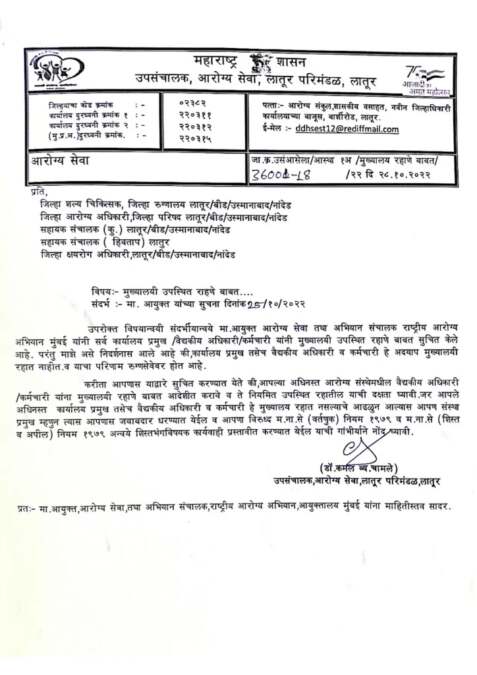 मुंबई (मनीष कांबळे :खबऱ्या प्रतिनिधी) – आरोग्य विभागाचे डॉक्टर, कर्मचारी, अधिकारी हे मुख्यालयी न राहता, शहराच्या ठिकाणी किंवा इतर ठिकाणी राहून अप-डाऊन करतात. त्यामुळे खेड्यापाड्यातील रुग्णांना वेळेवर वैद्यकीय सेवा मिळत नाही. याबाबत सांगली जिल्ह्यातील अनेक प्राथमिक आरोग्य केंद्रातील असले प्रकार ‘गोपनीय खबऱ्या’नेही चव्हाट्यावर आणले होते. आरोग्य विभागात काम करणारे अनेक अधिकारी आणि कर्मचारी मुख्यालयी न राहता इतरत्र राहत असल्याचे निदर्शनास आल्यामुळे आरोग्य विभागाचे आयुक्त तुकाराम मुंढे यांनी एक परिपत्रक काढून मुख्यालयी राहण्याचा आदेश दिला आहे. तसेच, हे अधिकारी आणि कर्मचारी मुख्यालयी राहत नसल्याचे आढळून आल्यास शिस्तभंगाची कारवाई करण्याचा इशारादेखील मुंढे यांनी दिला आहे. तसेच, रात्रीच्या वेळी डॉक्टर रुग्णालयात हजर नसल्यास अशा डॉक्टरांना थेट निलंबित केले जाणार आहे.