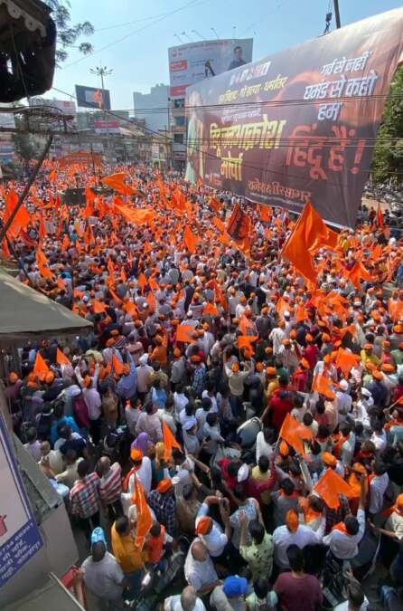 भवानी मंडप कमानीसमोर मोर्चाचे रूपांतर विराट सभेत झाले. हिंदुत्ववादी नेते सुरेश चव्हाण यांनी आपल्या भाषणात केवळ एक दिवस राजकारण करा, धर्मकारण मात्र कायम करा, असे आवाहन केले. चव्हाण यांनी अजित पवार यांचे नाव न घेता त्यांच्यावर सडकून टीका केली.