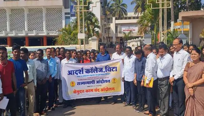 शिक्षकेत्तर कर्मचाऱ्यांच्या विविध मागण्यांसाठी महाराष्ट्र राज्य महाविद्यालयीन व विद्यापीठीय सेवक कृती समितीने राज्यव्यापी काम बंद आंदोलनाचा इशारा दिला होता. या मागण्या गेल्या अनेक वर्षांपासून शासन स्तरावर प्रलंबित आहेत. विट्यातील आदर्श महाविद्यालयातील शिक्षकेत्तर कर्मचाऱ्यांनी राज्यव्यापी अंदोलनाला प्रतिसाद देत सोमवारपासून बेमुदत काम बंद आंदोलन सुरू केले आहे. आश्वासित योजना पुनर्जिवीत करा, वेतनवाढीचा लाभ, रिक्त पदे भरण्यास परवानगी मिळावी, सातव्या वेतन आयोगाचा फरक मिळावा, सातव्या वेतन आयोगाची वेतन निश्चिती करावी, जुनी पेन्शन योजना लागू करावी, यासह वेगवेगळ्या मागण्या संघटनेने केल्या असल्याची माहिती बरकत मुलाणी यांनी दिली. या आंदोलनात सर्जेराव गायकवाड, संतोष शिंदे, राजेंद्र कांबळे, मिरासाहेब जमादार, सलिम मुलाणी, जनार्दन जावीर, सुभाष ठोंबरे यांच्यासह अनेक जण सहभागी आहेत.