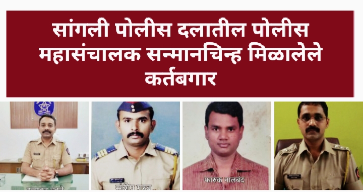 राज्य पोलिस दलात उल्लेखनीय, वैशिष्ट्यपूर्ण सेवांसाठी पोलिस महासंचालक सन्मान जाहीर करण्यात आले आहेत. सांगली जिल्ह्यातील काही पोलिस अधिकारी, कर्मचाऱ्यांचा सन्मान केला जाणार आहे. पोलिस महासंचालकांकडून दरवर्षी राज्य पोलिस दलात उत्तम सेवेसाठी कर्मचाऱ्यांना सन्मानचिन्ह देऊन गौरविण्यात येते.
