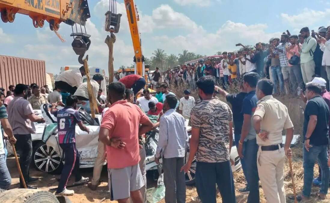 बेंगळुरु-तुमकूर राष्ट्रीय महामार्गावर नेलमंगल जवळ कार आली असताना तुमकूरहून बेंगळुरुला निघालेला कंटनेर दुसऱ्या कारला साईट देताना चालकाचा गाडीवरील ताबा सुटला. कंटनेर डिव्हायडरला धडकून दुसऱ्या बाजूला समोरुन येणाऱ्या चंद्राम इरगोंडा येगापगोळ यांच्या कारवर कोसळला. यात कारमधील सर्वांचा कंटेनर खाली चिरडून जागीच मृत्यू झाला. घटनास्थळी कर्नाटक पोलिसांनी क्रेनच्या सहाय्याने कंटेनर हटवून मृतदेह बाहेर काढले.