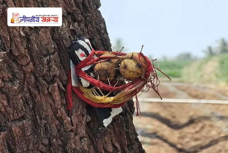 शेतातील झाडाच्या बुंध्याला काळी बाहुली, लिंबू आणि टाचण्या टोचल्या असल्याचं आढळून आलं आहे. हा प्रकार पाहून अनेकांनी आश्चर्य व्यक्त केले असून, हा प्रकार जादूटोण्याचा असावा, अशी शंका लोकांकडून व्यक्त केली जात आहे. विज्ञानाच्या युगात अशा प्रकारच्या अंधश्रद्धा सुरू असल्याने अनेकांनी डोक्यालाही हात लावला आहे.